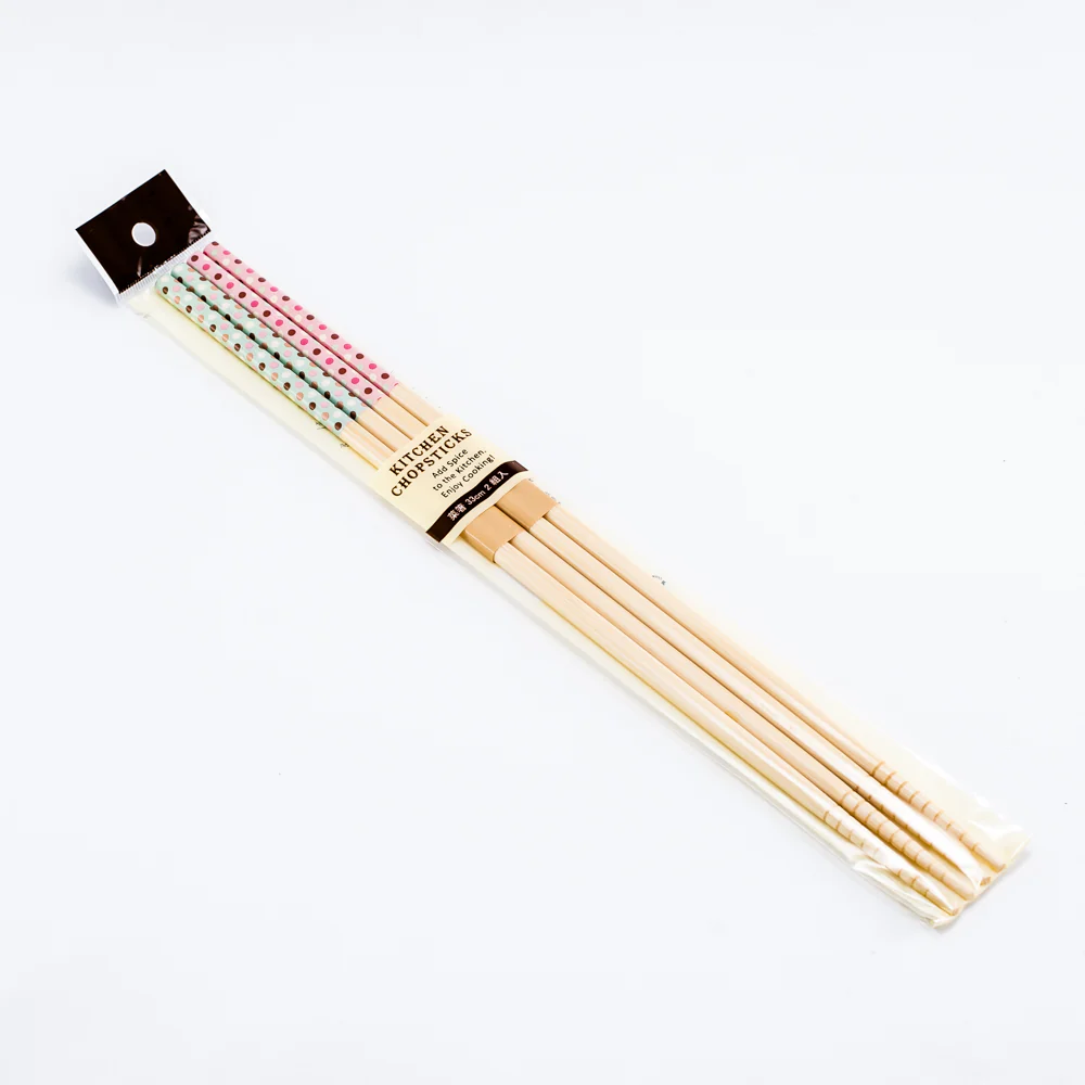 2 pairs of cooking chopsticks. Cute polka dots pattern. Natural bamboo is used. Due to the nature of bamboo, the chopsticks may have slight distortion.