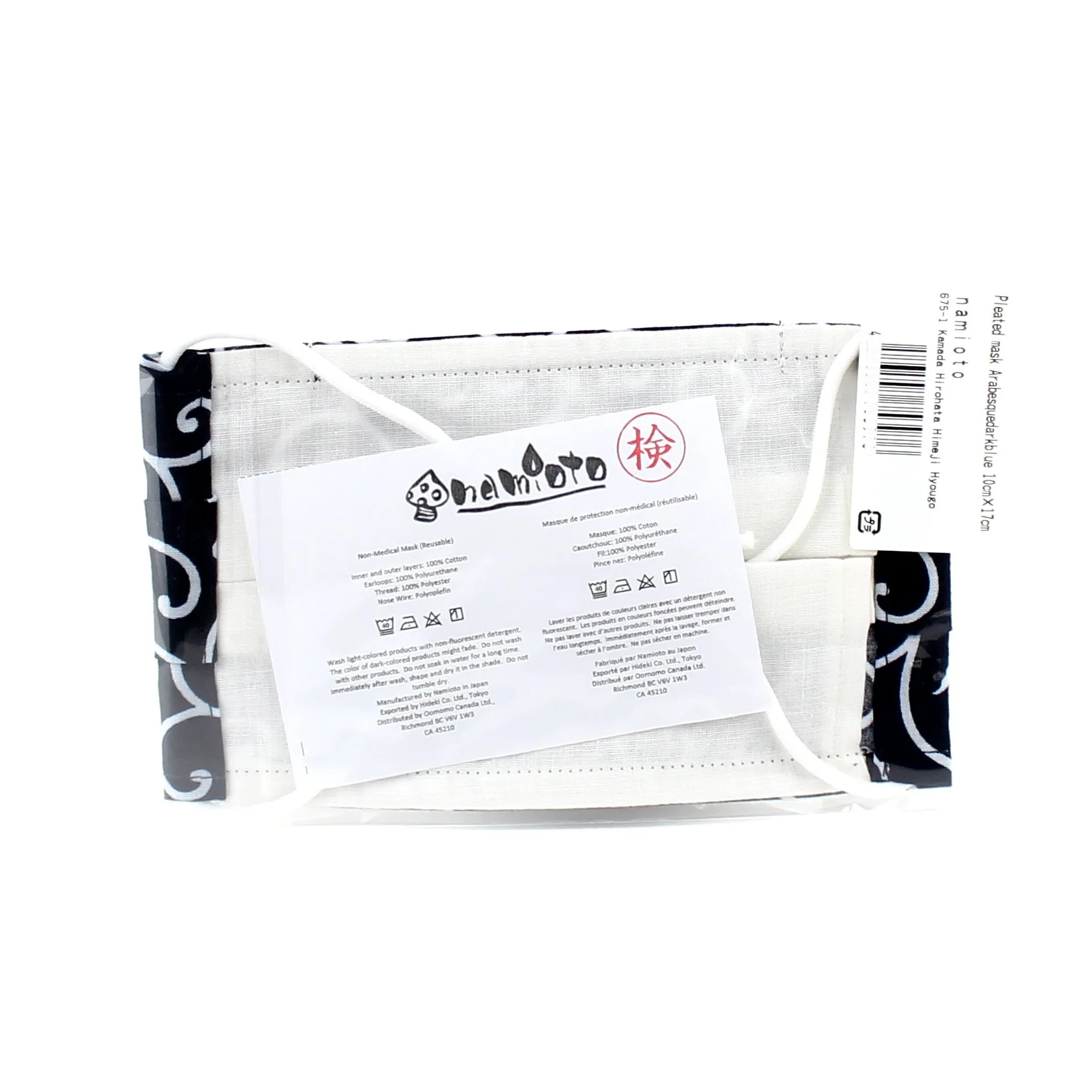 Stylish, cute and reusable mask. Soft and gentle to the touch! Stretch out the pleated front for a comfortable fit. Unisex. Size: L. Karakusa-arabesque pattern in dark navy. Made in Japan.