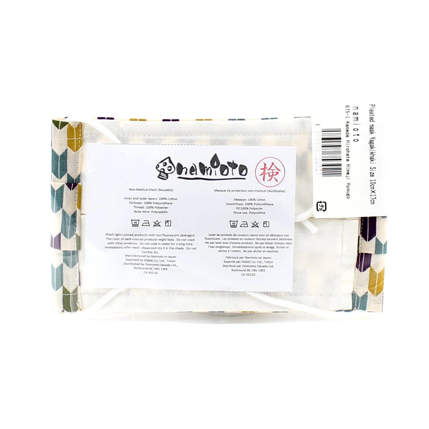 Stylish, cute and reusable mask. Soft and gentle to the touch! Stretch out the pleated front for a comfortable fit. Unisex. Size: L. Arrow pattern in khaki. Made in Japan.